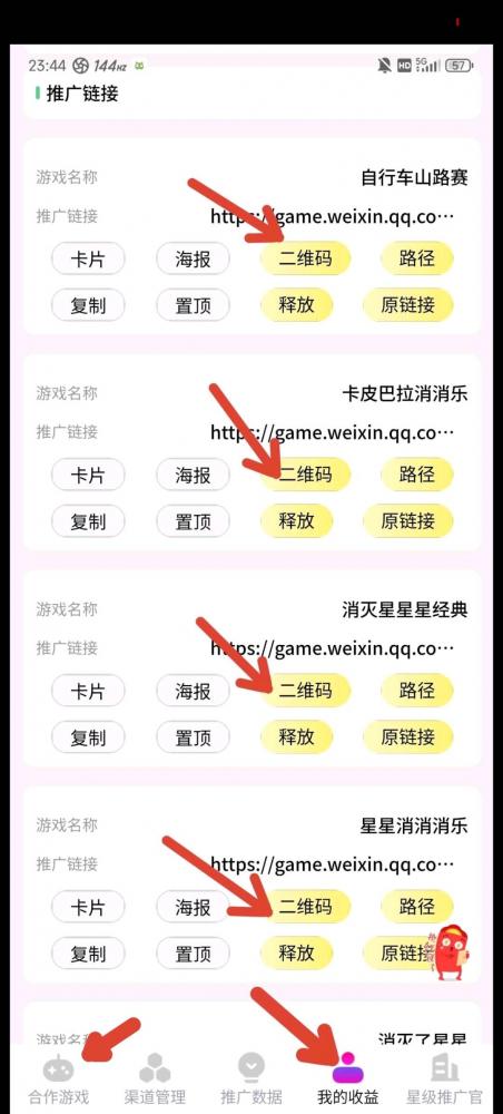 再次点击我的收益页面 把五个游戏全部生成二维码 返回微信打开扫一扫 进去玩一下 每个都看5个广告至少
